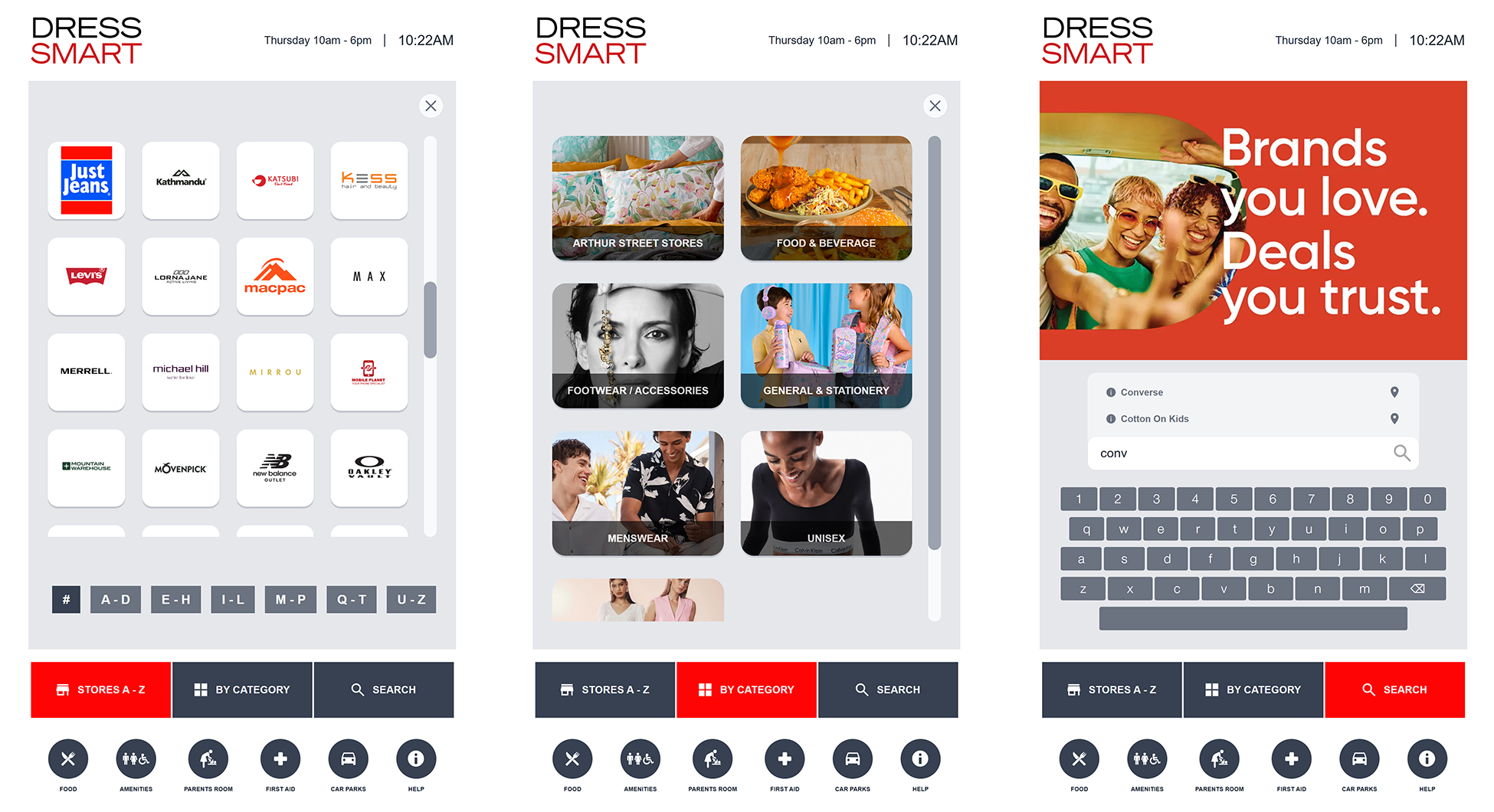 The centre’s distinctive double-loop layout can be tricky to navigate, particularly for first-time visitors. We developed five interactive touch-screen kiosks positioned at key locations throughout the mall, each featuring a clean, intuitive interface that allows shoppers to search for stores, browse by category, and plan their route with ease.
